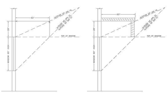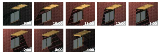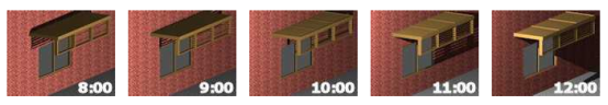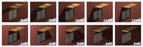 从中我们可以看出遮光阴影最好的是在一天中的正午时分,而在早上和傍晚遮阳棚不能有效地挡住眩光和热量进入室内,这时可以通过改进来提高遮阳效果。
