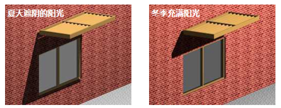 随着不同季节太阳高度的变化,这种遮阳棚能够带来不同的遮阳效果,在采暖季节阳光可以直射室内,而在夏季能有效的控制阳光的射入量,最大程度地降低建筑物能耗。